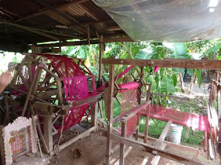 the family has a spinning wheel and two old wooden looms at work.We are invited to look into their home which