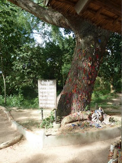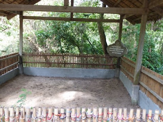 As we walked around the relatively small area there are signs about what was here or there; as not much was preserved in this former Chinese cemetery.  (Because Cambodians are fairly superstitious they do not like to be near cemeteries; hence it was a good choice to secret the horrors that were to occur there.)  There are a few areas cordoned off with crude bamboo fencing marking mass graves designated for those who were women or who were decapitated.  There is a Plexiglas box with bones and teeth inside and another with some clothes.