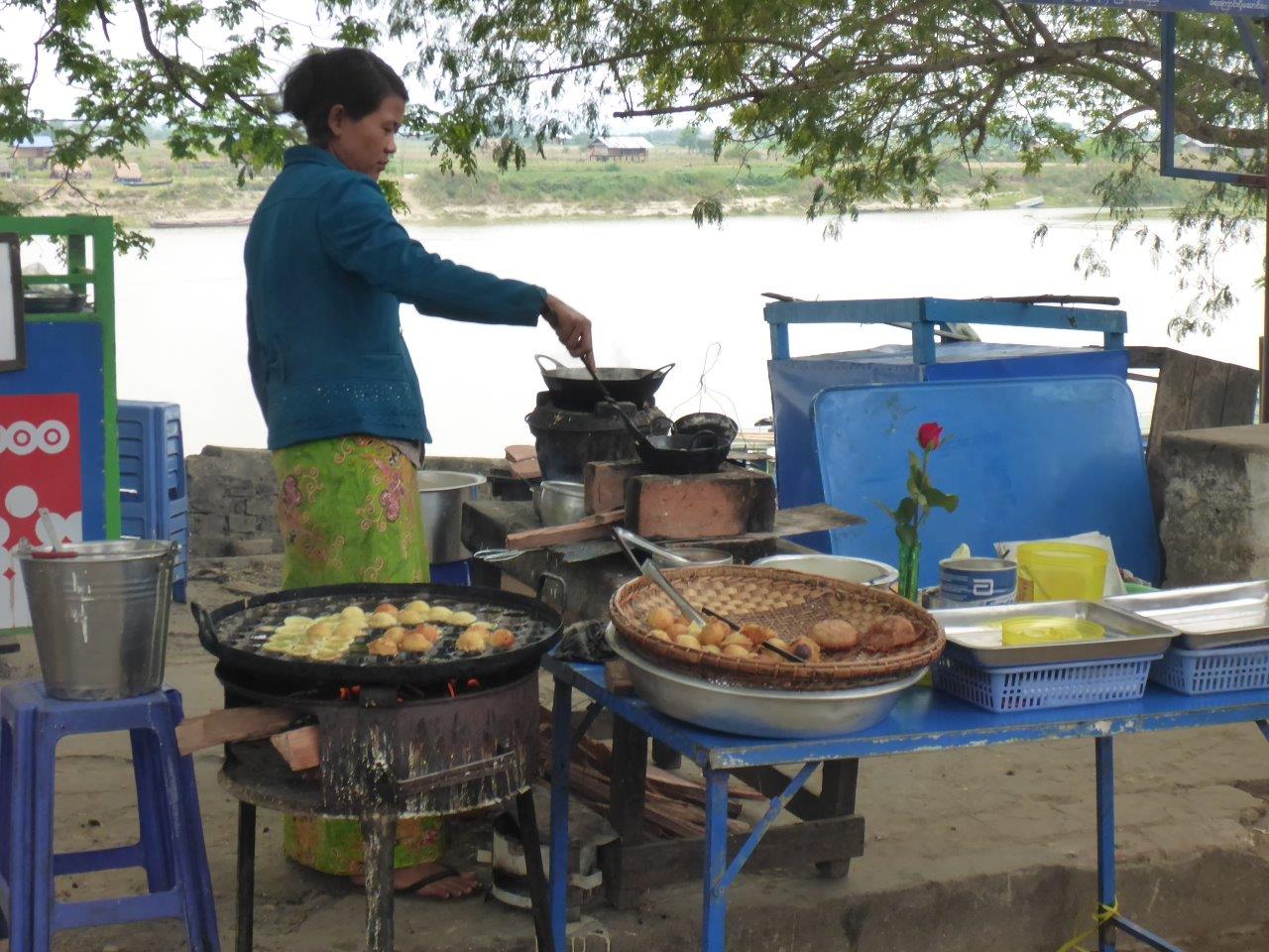 Just as we were about to embark a sampan for a 45 minute slow ride to take us to the ship (as the water level right now is too low for the ship to make it all the way to Bhamo) I saw a street vendor making fritters (known as Husband and Wife – as the bottom is cooked (wife), then another piece is placed on top (husband) trapping the filling (the baby) ) – which, of course, I had to try. It is made with palm sugar, but it is not sweet to the Western palate.