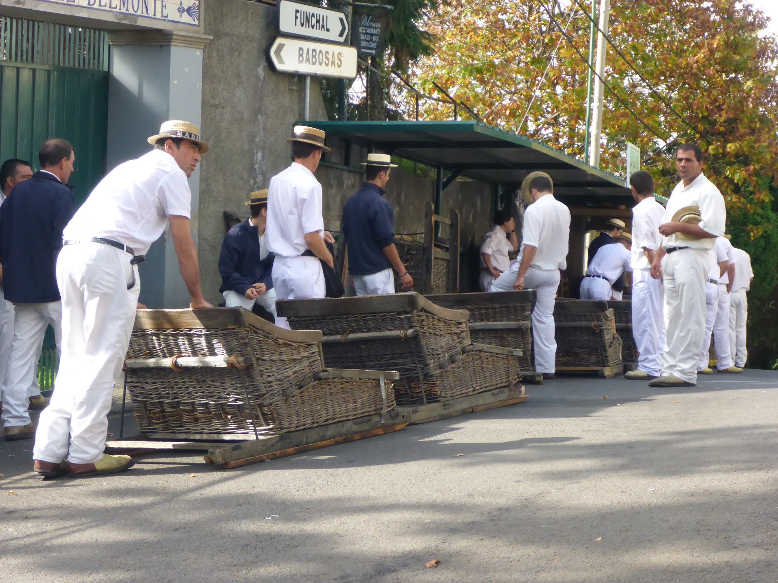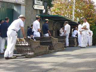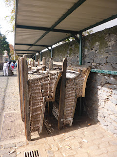 | Ancient wicker toboggans waiting to slide you down the steep roads of Funchal! |