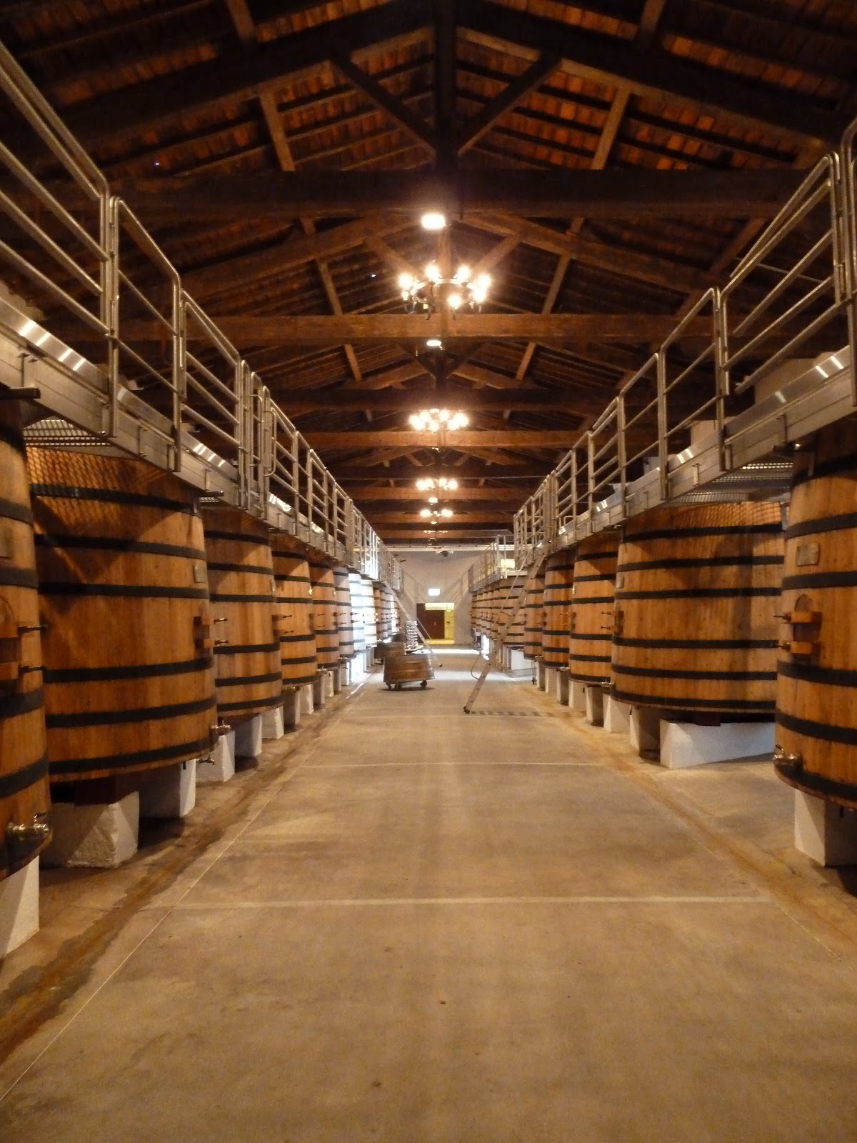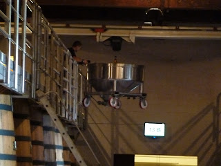 year old wooden vats for the vinification process. Ironically, I see very modern overhead hoists