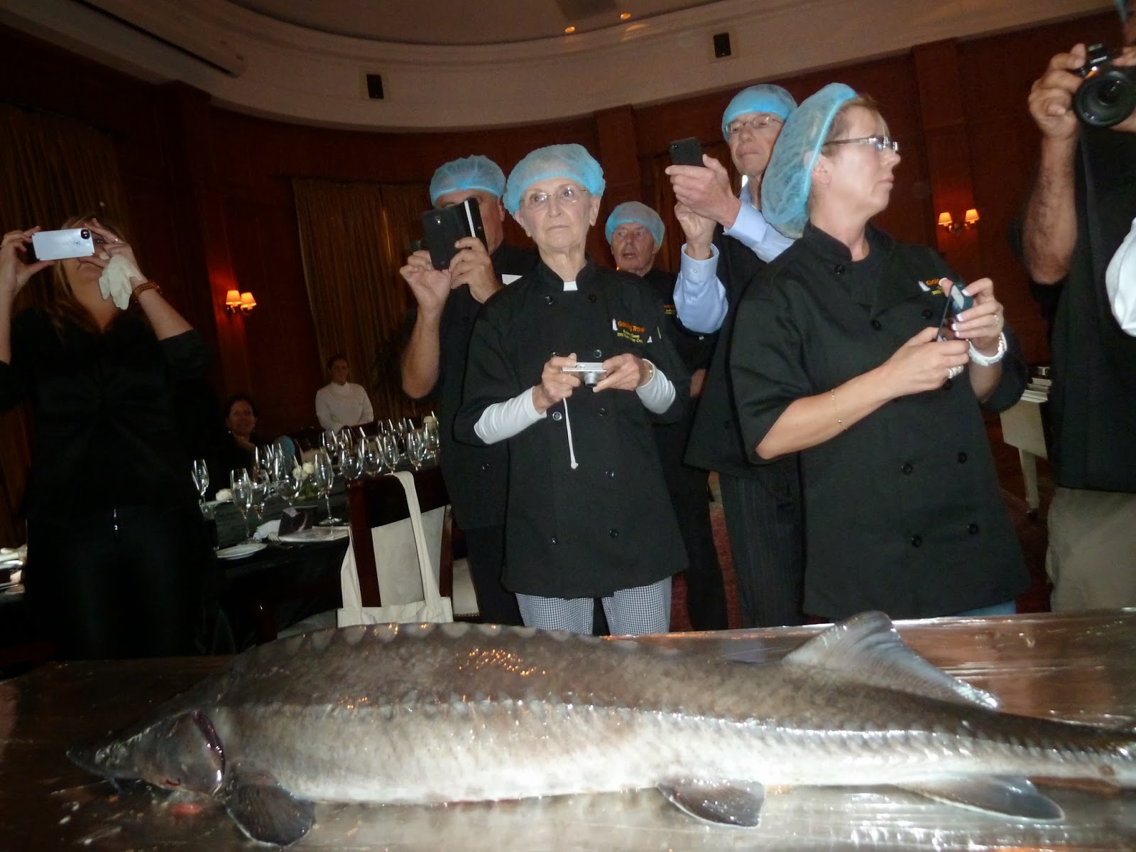 So with that Black River Caviar brought out four fresh sturgeon. After I explained the various interesting (at least to me) things about this unique and prehistoric animail, one by one each guest came to the processing table and touch the fish, its unique scales, its barbels and its toothless mouth.
