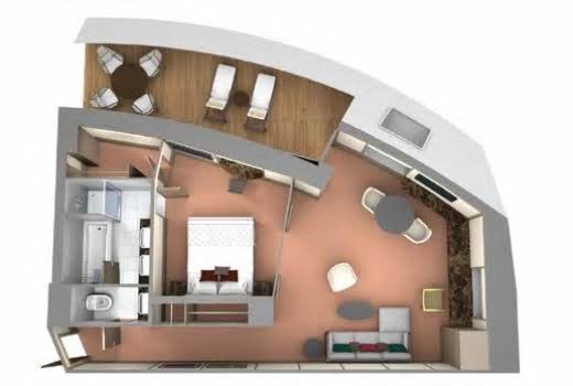 Owner’s Suite: The two Owner’s Suites, located on Deck 7 (Suites 700, 701) overlooking the bow have a total space 1,023 sq. ft. (95 sq. m.) including a spacious veranda of 484 sq. ft. (45 sq. m.). With its private bedroom and extra-large walk-in closets, these suites the amenities of the Penthouses.