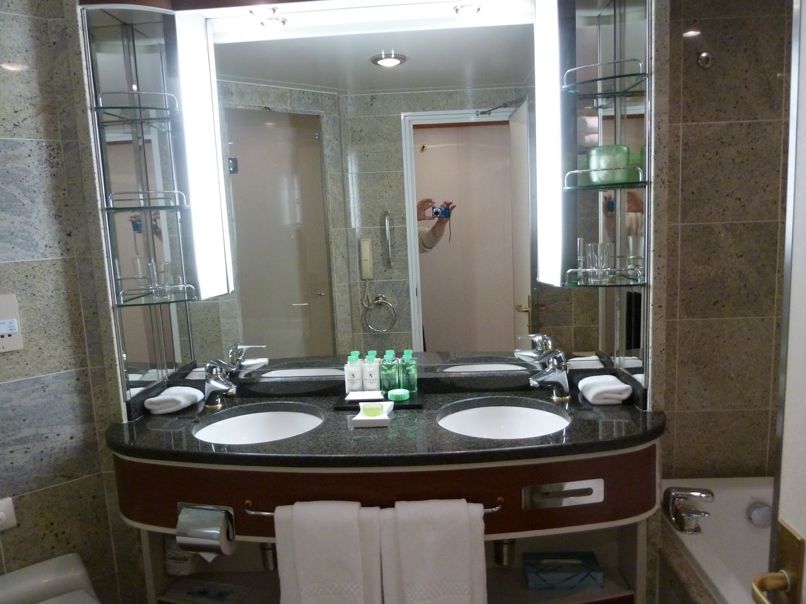 The bathrooms are fairly compact, but perfectly acceptable for a luxury cruise ship.  They are quite nice with double lavatories and separate bath and shower with nice touches of granite.  The shower, curiously, is a plastic composite – though solidly made.  I do not believe bathrooms make or break a cruise, but a nice bathroom is a welcome retreat.