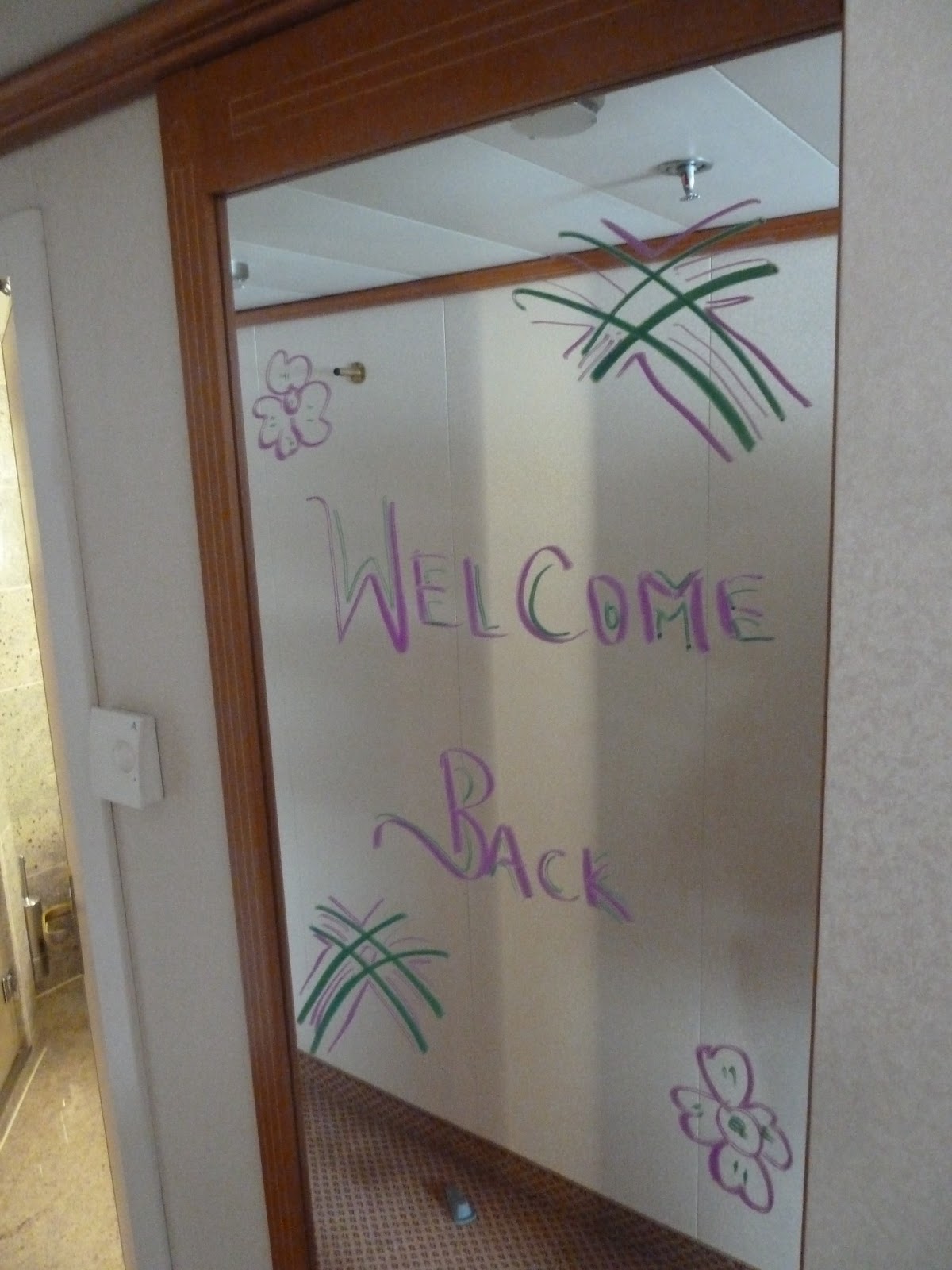 greeted by a Welcome Home note drawn on one of our suite mirrors…the posting of