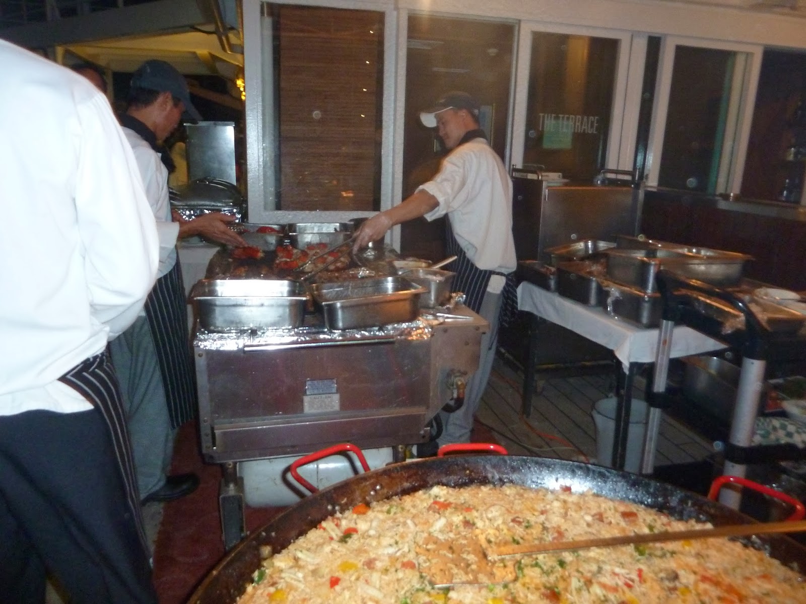 I headed up to Veranda, which has an inside and outside dining area.  This is pretty much the breakfast/lunch venue.  I never ate inside as I could not find a reason to do so when a breeze and sunshine under cover was so nice.  Breakfast consists of the standard fare with some slight variation. You may also order fried, poached, etc. eggs, pancakes and more from the waiter.  At lunch there is a hot buffet that varies day to day along with a number of salad items, cold dishes and one hot chef’s ala minute item (such as a pasta dish).  In addition, hamburger and more are available to order from the wait staff. Note:  The Veranda area on the Seabourn Pride/Star Pride is where, not coincidentally, the Veranda will be located.
