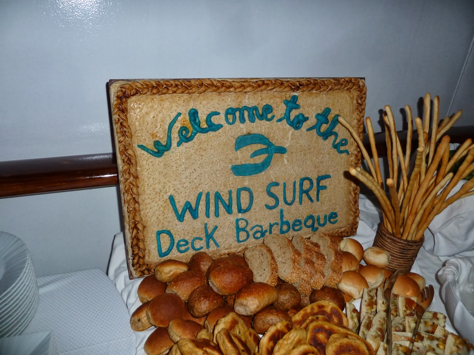 I should also mention The Yacht Club, which is sort of a Starbuck-esque coffee bar where you can also select from pre-made (but fresh) fruit cups, yogurts, etc. at breakfast and sandwiches and wraps from the late morning.  The latter are provided so you can take them off the ship when you tour or hit the beach; even providing soft lunch boxes if desired.  (Windstar also provides bottled water as you disembark the ship for tours; another nice touch.)